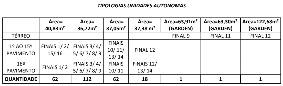 QUANTIDADE DE APARTAMENTO POR PAVIMENTO TIPO: 3 un. Pav. térreo + 16 Un. por pav. (1o ao 15o) + 14 un. pav. 16o